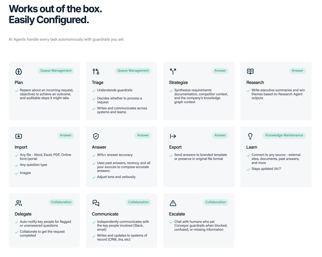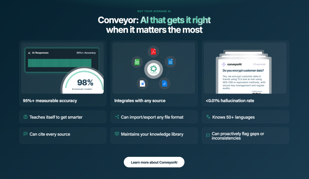 更有意思的是,我注意到Conveyor成为了多家顶级企业”第一个在生产环境中完全部署的AI供应商”。这个事实特别值得深思,因为像Zendesk、Atlassian、Qualtrics这样的公司通常对新技术采用极其谨慎,他们有严格的安全标准、合规要求和风险控制机制。他们选择Conveyor作为首个AI agent解决方案,说明了几个重要问题:第一,安全审查和RFP处理确实是这些企业面临的重大痛点;第二,Conveyor的技术成熟度和可靠性已经达到了企业级标准;第三,这个应用场景对AI的容错性相对较高,适合作为AI agent的突破口。
