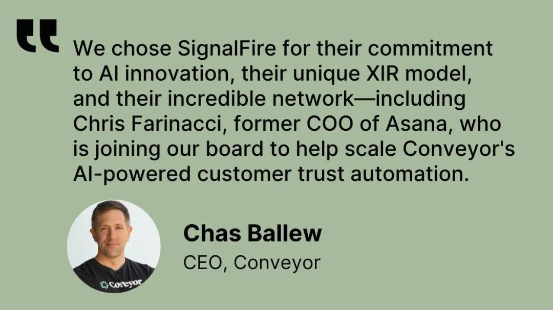 我特别认同SignalFire对这一趋势的判断:随着这种向agent的转变站稳脚跟,他们相信将有10-15家类别领先的公司崛起,主导按组织功能划分的个别高价值业务工作流程。在采购、金融和客户体验等领域,我们可以期待有意义的创新。简单来说,Conveyor就是今天为客户信任工作流程而构建的世代性公司。他们的AI agent充当值得信赖的队友,处理繁重的工作,释放人类专注于最重要的事情。