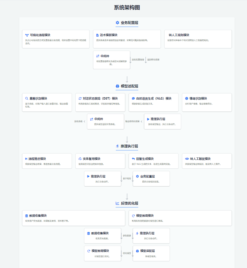 - 业务配置层:(可视化流程、话术模板、转人工规则)通过中间件转化为模型可理解的参数(如状态转移矩阵、风格嵌入、阈值);