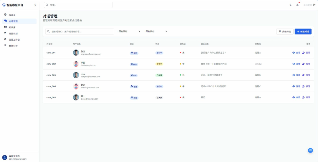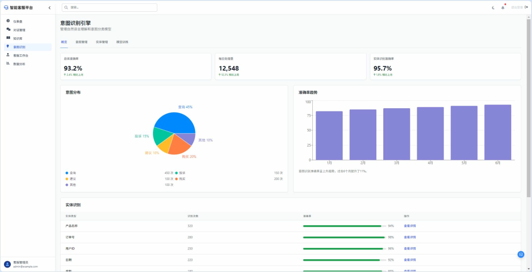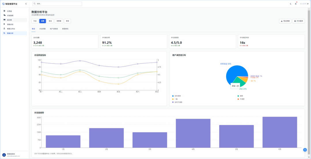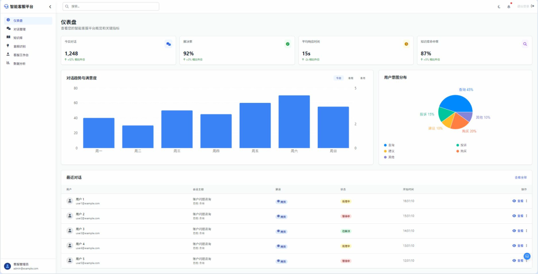 - 系统性能分析:跟踪AI意图识别准确率(如“‘投诉’意图识别准确率92%,‘售后’仅78%”)、知识库匹配成功率、人工客服响应时长;服务质量评估:通过用户满意度评分(如“五星好评占比”)、问题解决率(如“一次对话解决80%问题”)评估服务效果;