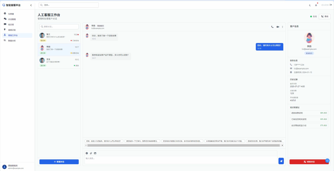 - 用户画像集成:展示用户历史订单、咨询记录、标签(如“高价值客户”“投诉过物流”),帮助客服个性化服务;