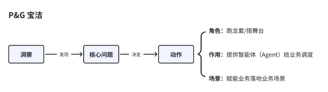 我总结出来这个图,是宝洁介绍的AI应用方法论。他们并没有用具体实例来拆解到底是怎么做的,而是抽象出来几个关键点:洞察、核心问题、动作。