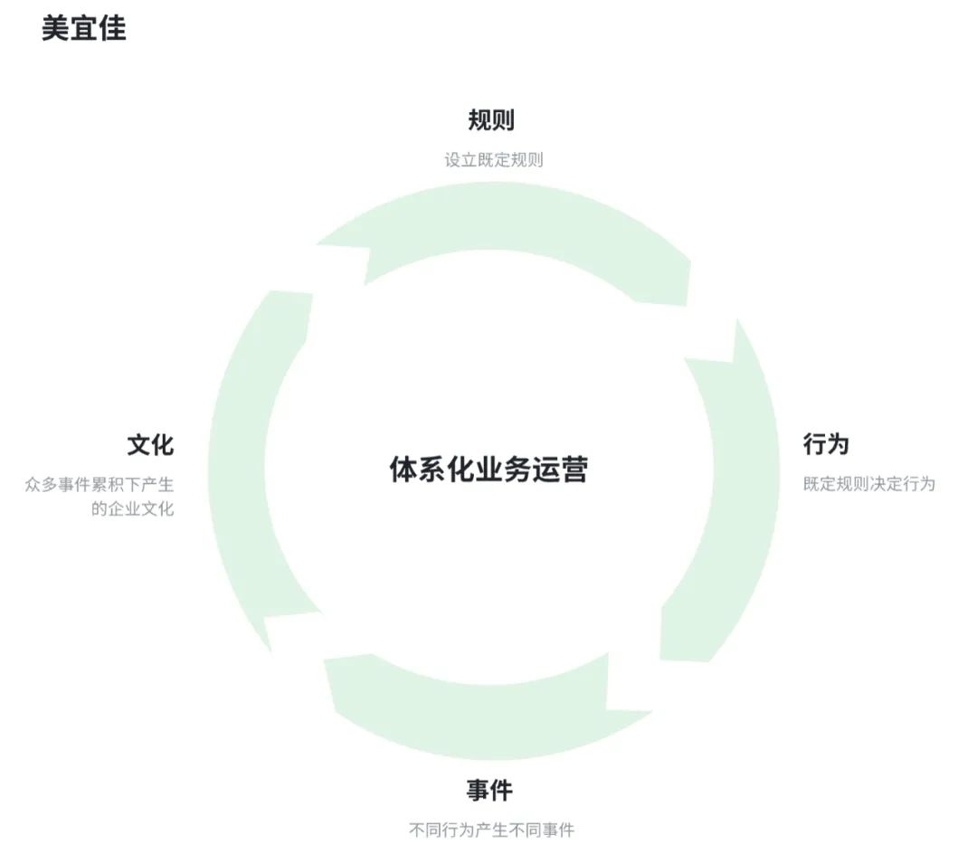 从图上可见,美宜佳更强调体系化地运营AI,且他们的核心观点是这个运营体系是在闭环中迭代:通过建立企业级的规则来规范员工的行为,由于有不同的行为产生了不同的事件,再由这一个个单点的事件催生出新的企业文化,最后基于新的企业文化再优化或者新建新的规则。