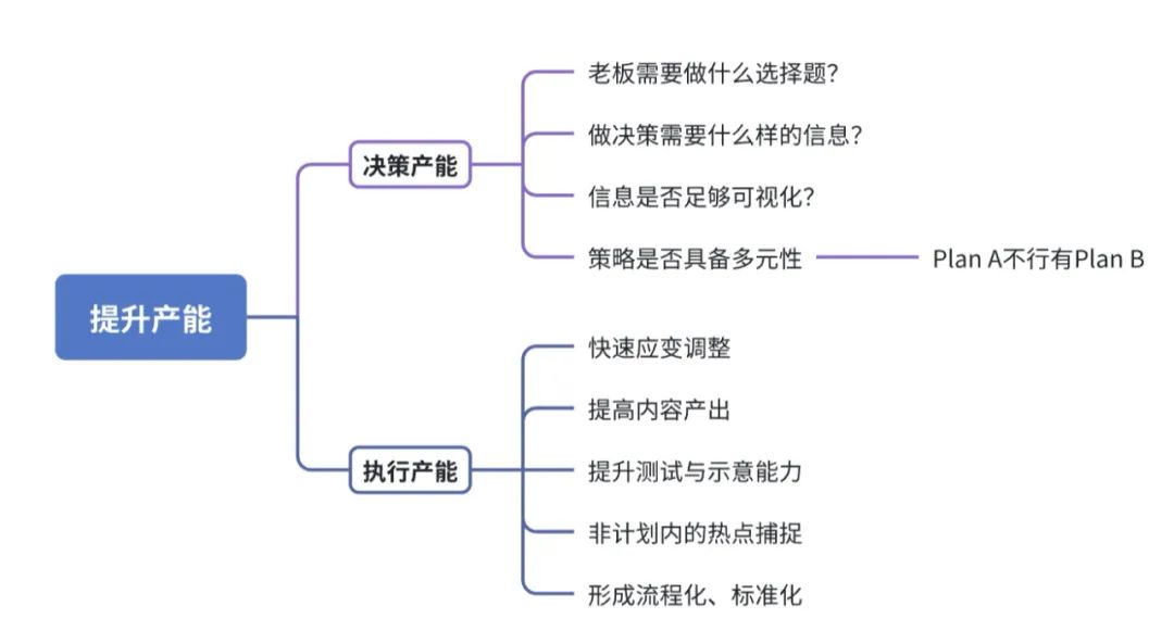 他们基于现状总结了需要提升的两大关键产能:决策产能和执行产能。用大白话来说就是,企业如何最快速度做决策,如何用最高效率把事情做完。