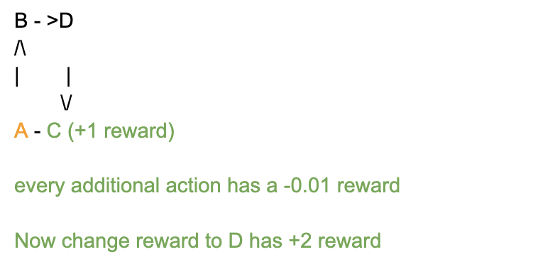 现在我们把设定稍微改一下:C 点的 reward 是 +1,而 D 点的 reward 是 +2,而且 D 不能从 C 到达,只能通过 B 到 D,再到达。那最优路径其实是 A → B → D → C。但由于 Agent 早早就学会了走 A → C,它就会完全忽略掉 B 和 D,从而无法获得更高的总 reward。