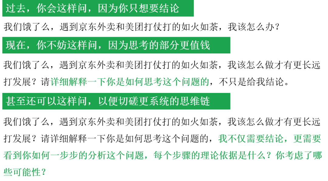 但我现在会这么问:“我遇到美团和京东激战,饿了么怎么才能长期发展?你是怎么一步步分析这个问题的?每一步的依据是什么?”