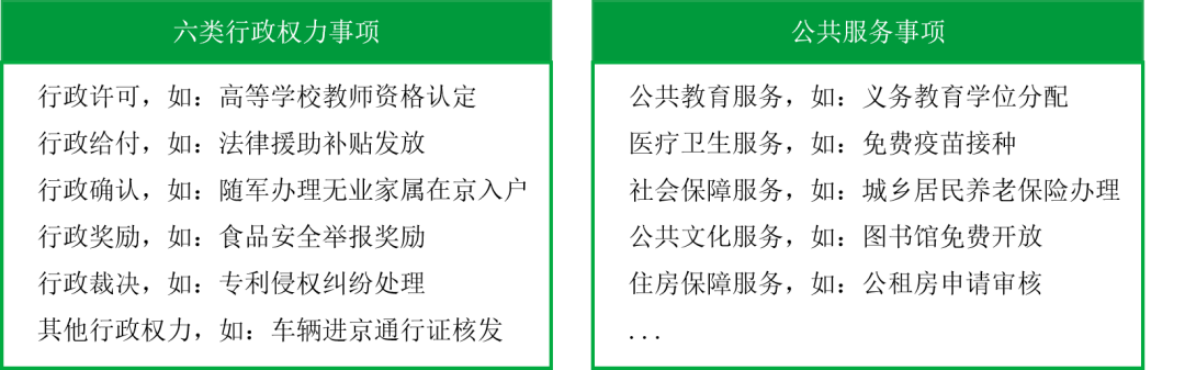 - 另一类是政府为人民提供的公共服务事项,比如接种疫苗、公租房申请、孩子上学这些,叫“公共服务事项”。
