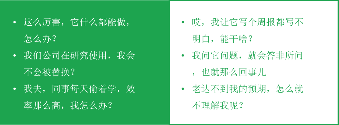 - 另一种是看不上AI,说它问一句答一句,周报都写不明白,语义老跑偏,感觉“也不过如此”。