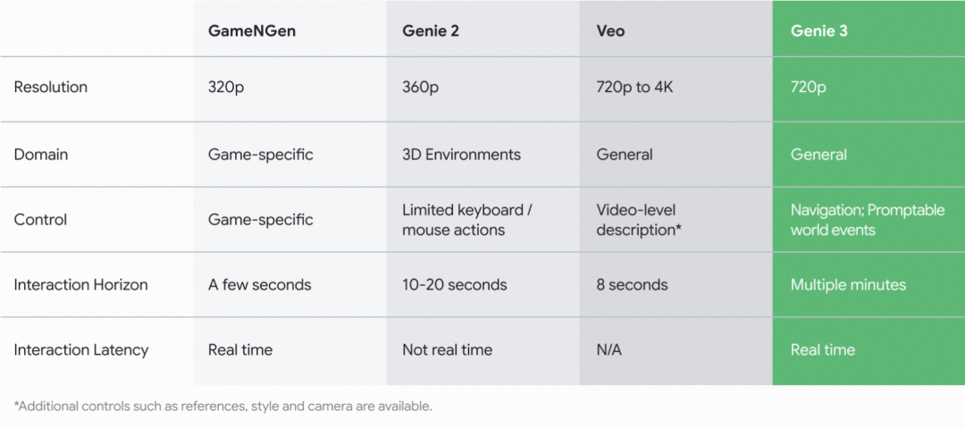 3. “实时交互”的王者归来 (The Return of “Real-Time”)非常有趣的一点是,中间的Genie 2为了追求更复杂的3D环境生成,牺牲了“实时性”。而Veo作为一个视频模型,更不存在实时交互的概念。但Genie 3在实现了远超前代复杂度的同时,成功回归了“实时交互”,这背后是算法和算力的巨大突破。720p的分辨率正是为保证实时流畅体验而做出的最佳平衡。