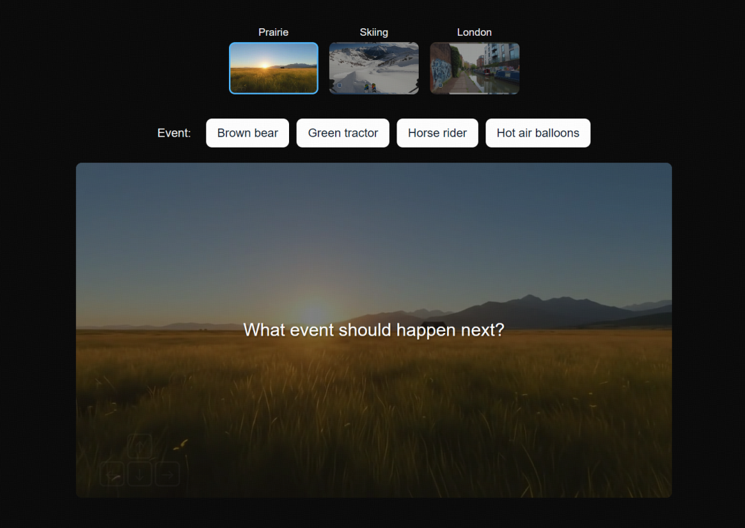 - 可提示的世界事件(PromptableWorldEvents):这是它的“杀手锏”。当你已经身处这个世界时,你可以继续用文字下达指令来改变它!比如,你正走在一片平静的火山旁,可以输入“让火山喷发”,然后眼前的火山就会开始涌动岩浆!