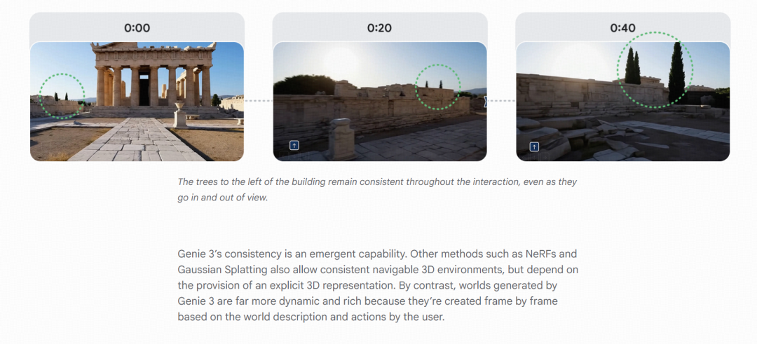 首先,它并不完美。目前的交互时间只有几分钟,画面偶尔有瑕疵,对复杂物理规则的理解也有限。它还不能100%复刻一个真实的地点。