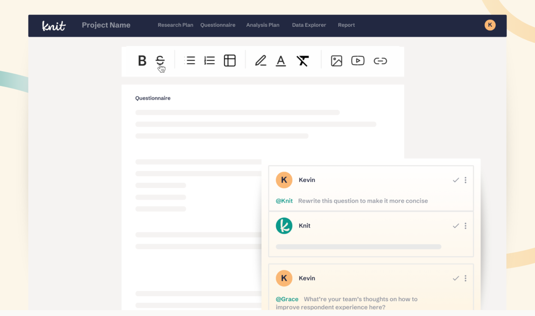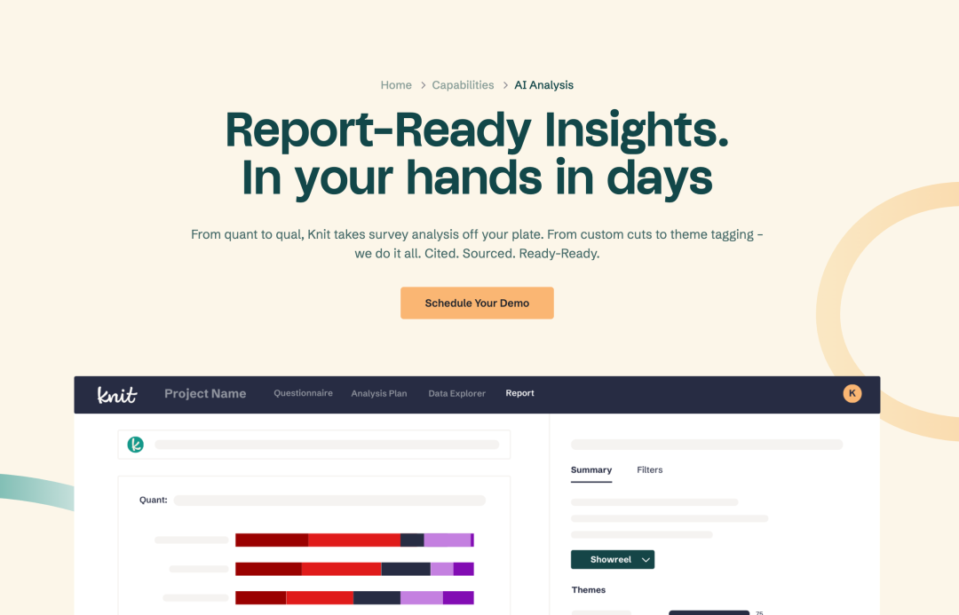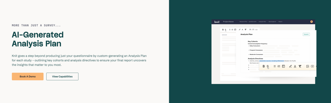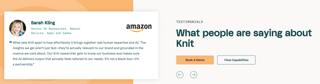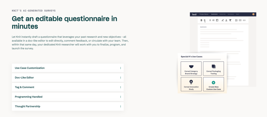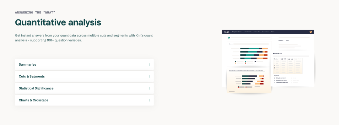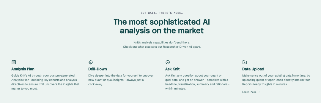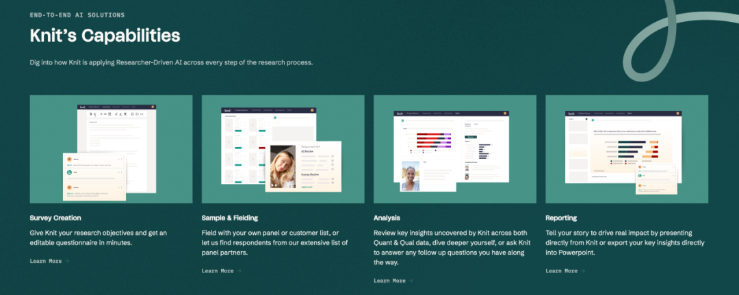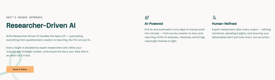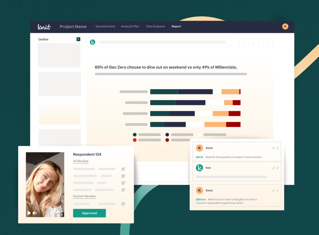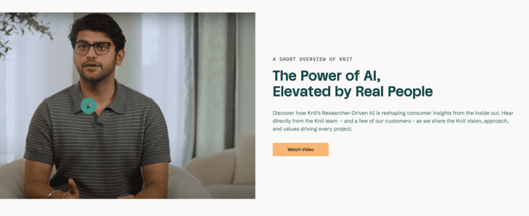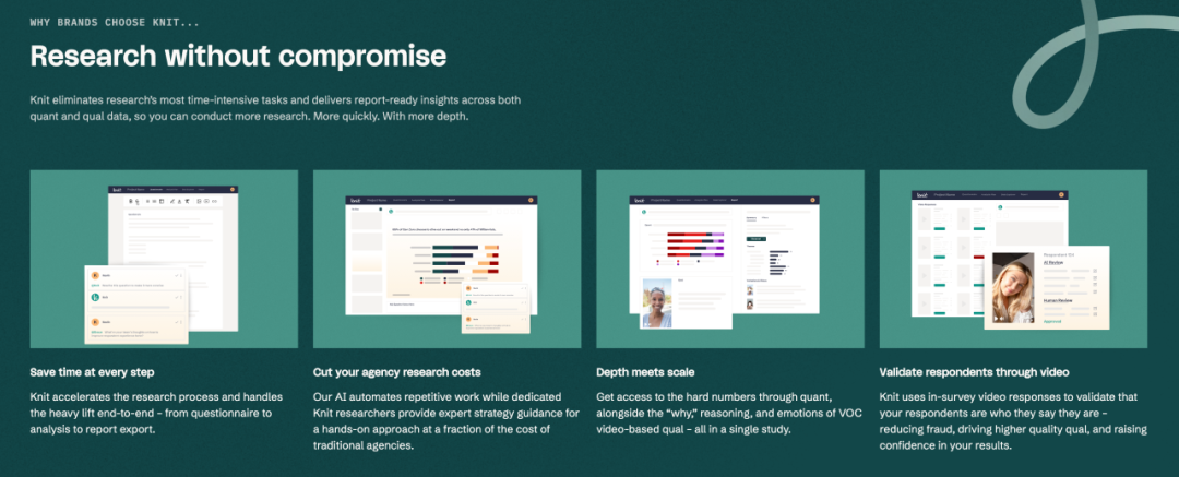 Knit 通过让专业研究员与客户深度合作,将客户的具体目标、研究风格和业务背景嵌入到平台中,让 AI 能够生成真正定制化的洞察。这种方法确保了每个研究项目都能反映客户的独特需求,而不是千篇一律的标准化结果。