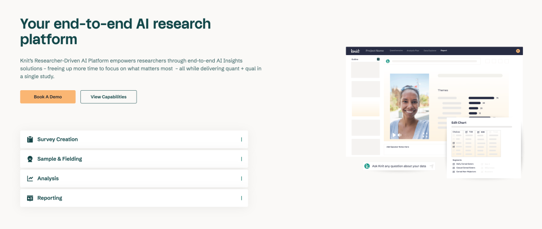 从技术实现角度看,Knit 的平台确实称得上是”AI 原生”的。他们不是简单地在传统调研流程中添加一些 AI 功能,而是从头开始重新设计了整个研究流程,让 AI 成为每个环节的核心驱动力。在研究设计阶段,AI 帮助优化问题类型、流程设计和数据结构,确保后续的分析能够更加高效。
