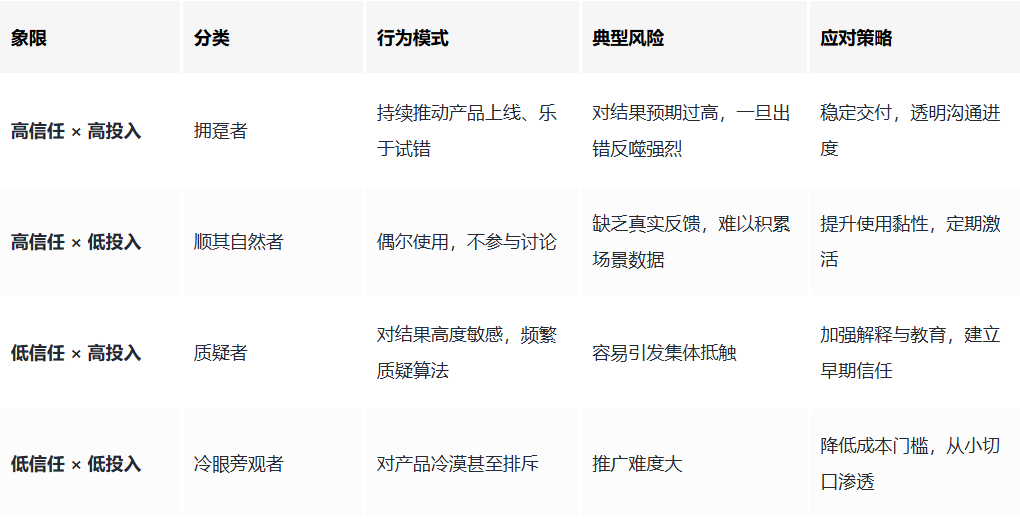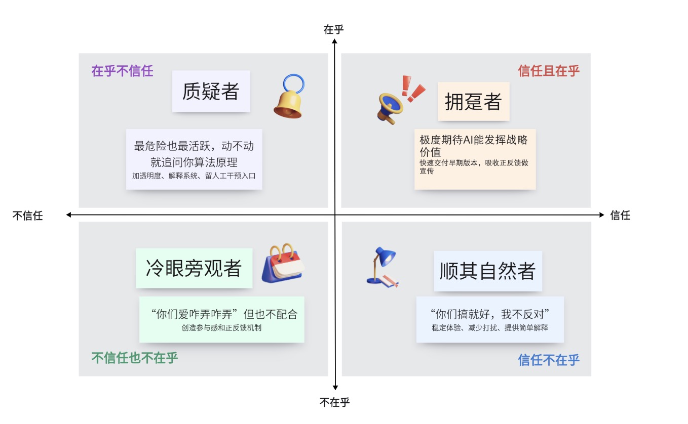 如果你正在管理一个AI产品,建议试着画出你项目里的“情绪雷达图”,看看不同群体的信任度与情绪投入度,再从情绪管理出发,去优化落地方案。