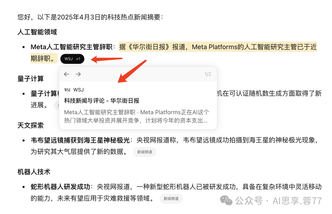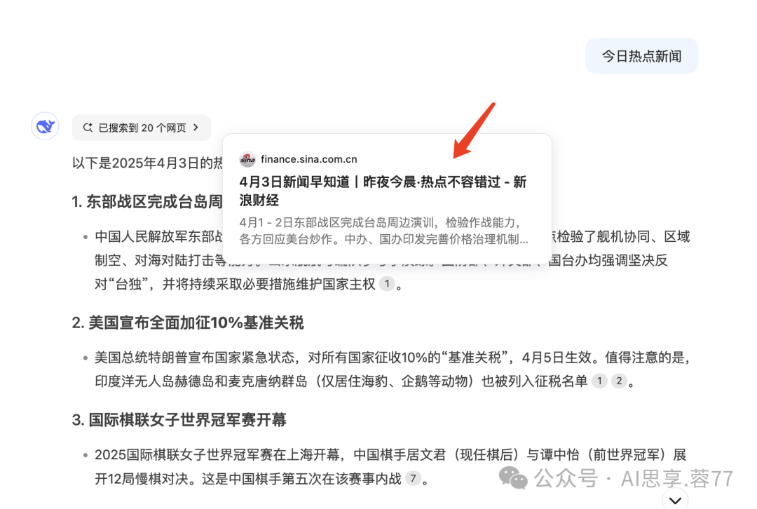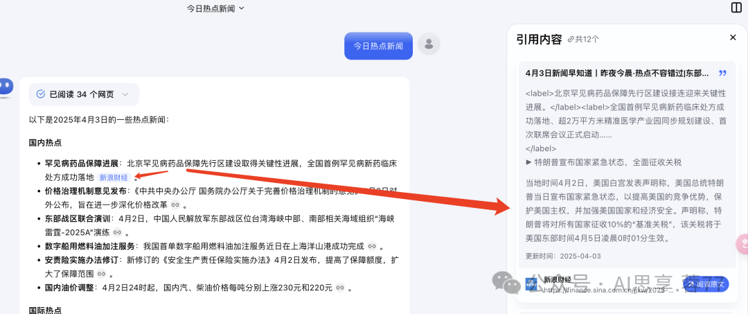 你是否注意到,在与 AI 智能体互动时(比如开启搜索功能),有些答案会附带明确的来源说明?这样的标注不仅增强了答案的可信度,也方便你随时回溯原始信息,验证内容是否准确。如下图所示:
