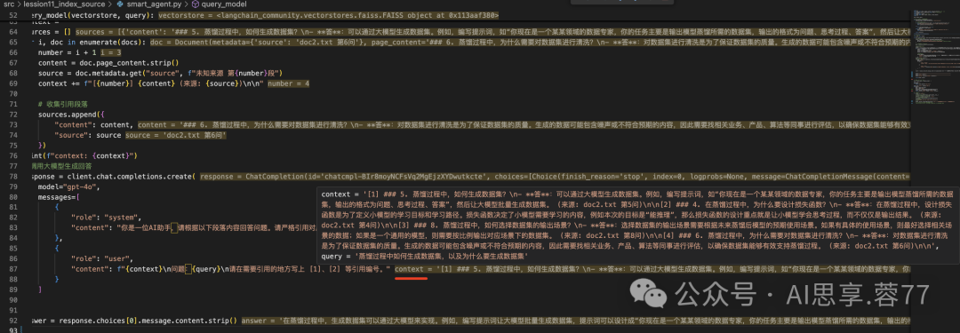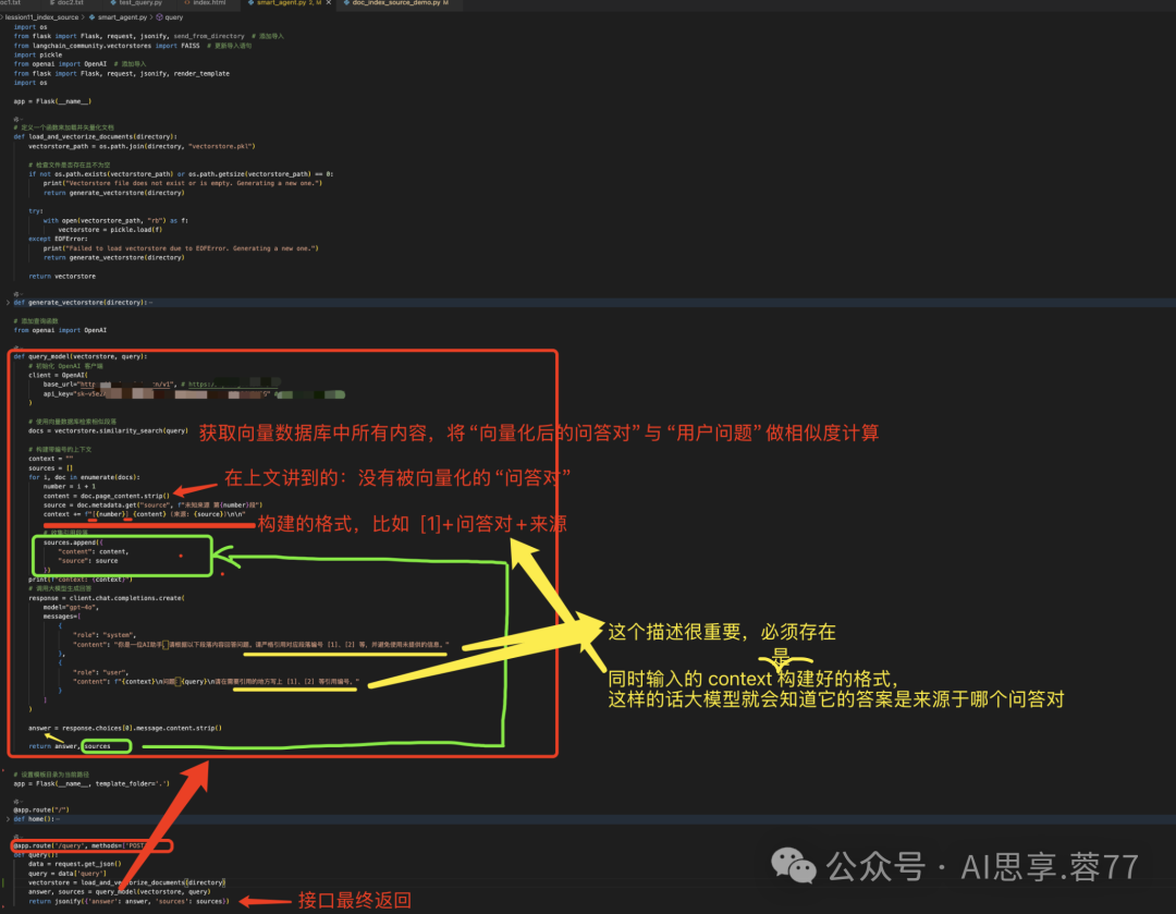了解了向量化存储格式后,我们再来看这一功能在接口层面是如何实现的。下面这段代码展示了核心的请求逻辑:如何从向量数据库中检索相关问答、构造带来源标注的上下文,并最终将这些信息一并传入大模型生成回答。