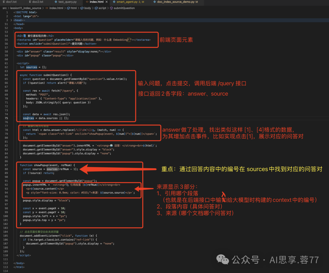 最后,我们来看前端页面是如何展示这些内容的。从图中可以看到,前端通过解析接口返回的answer和sources字段,不仅展示了生成的回答,还实现了对引用编号的高亮和点击事件处理,用户点击如 [1]、[4] 时,即可查看对应的原始问答内容及其来源。