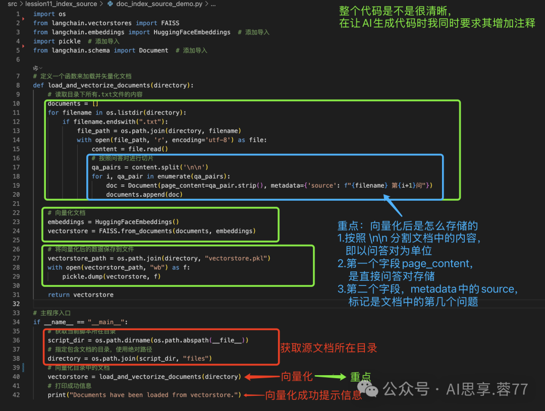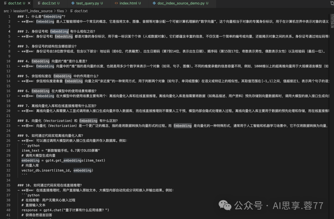 doc = Document( page_content=”Q: 什么是 Embedding?nA: 是将对象转换成向量…”, metadata={“source”: “doc1.txt 第1问”})
