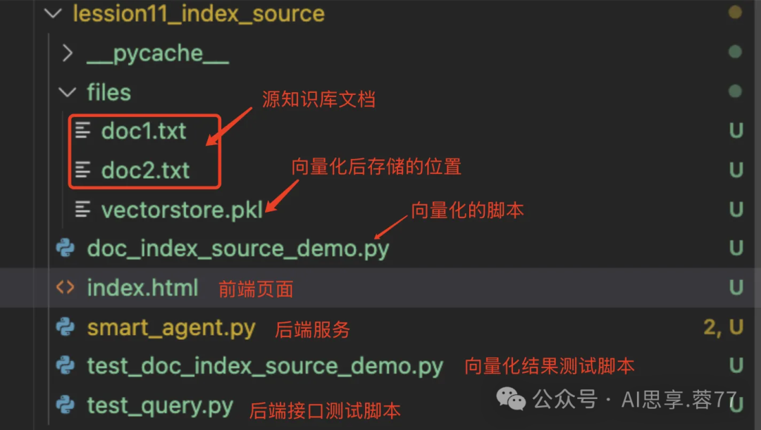 通过这个目录结构,我们可以清楚地看出,整个实现大致分为三个部分:源数据的向量化处理、后端接口的开发,以及前端页面的构建。