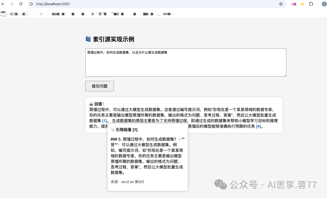 这样整套流程就串联起来了:从文档构建知识库 → 向量化处理 → 后端相似度检索与引用格式构建 → 前端展示与交互补充,一整套功能就实现了。