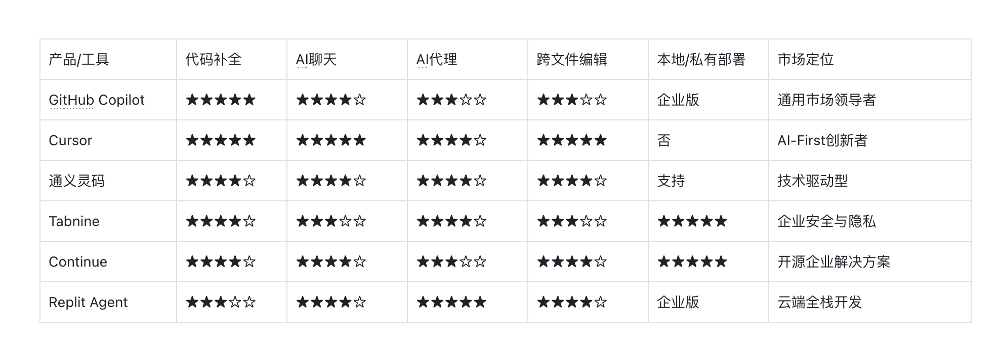 市场呈现出“一超多强”的格局。GitHub Copilot凭借先发优势和生态壁垒稳居第一。Cursor、Codeium、Tabnine等作为强有力的挑战者,在细分领域或通过差异化创新获得市场份额。Replit等则开辟了云端开发的新战线。