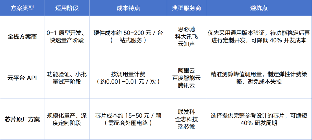 在语音交互硬件落地进程中,技术方案的选型是决定项目成本与周期的关键因素。以下从适用阶段、成本构成、实施风险三大维度展开对比分析: