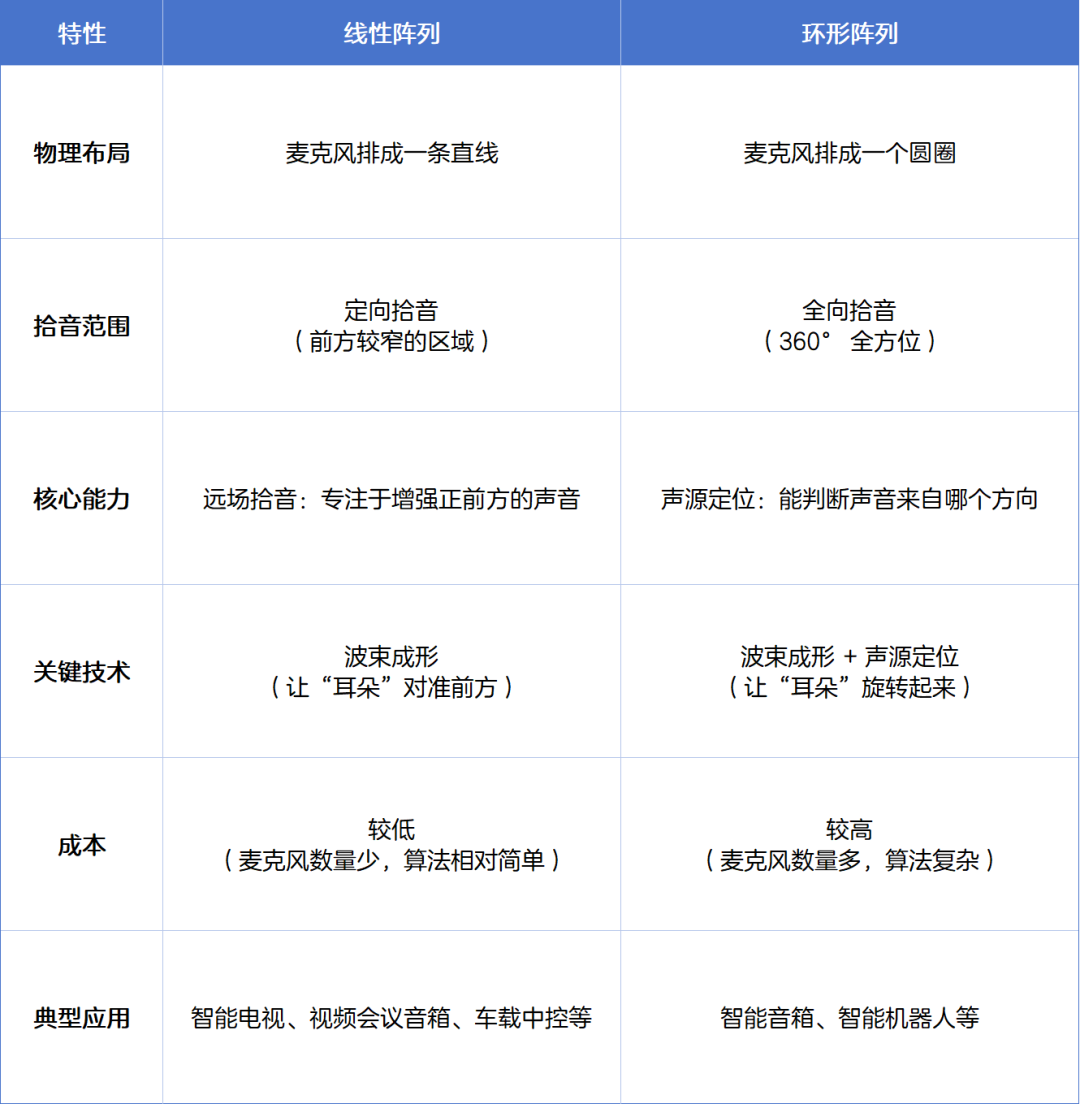 麦克风阵列有两种布局类型:线性阵列、环形阵列