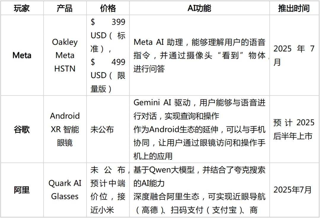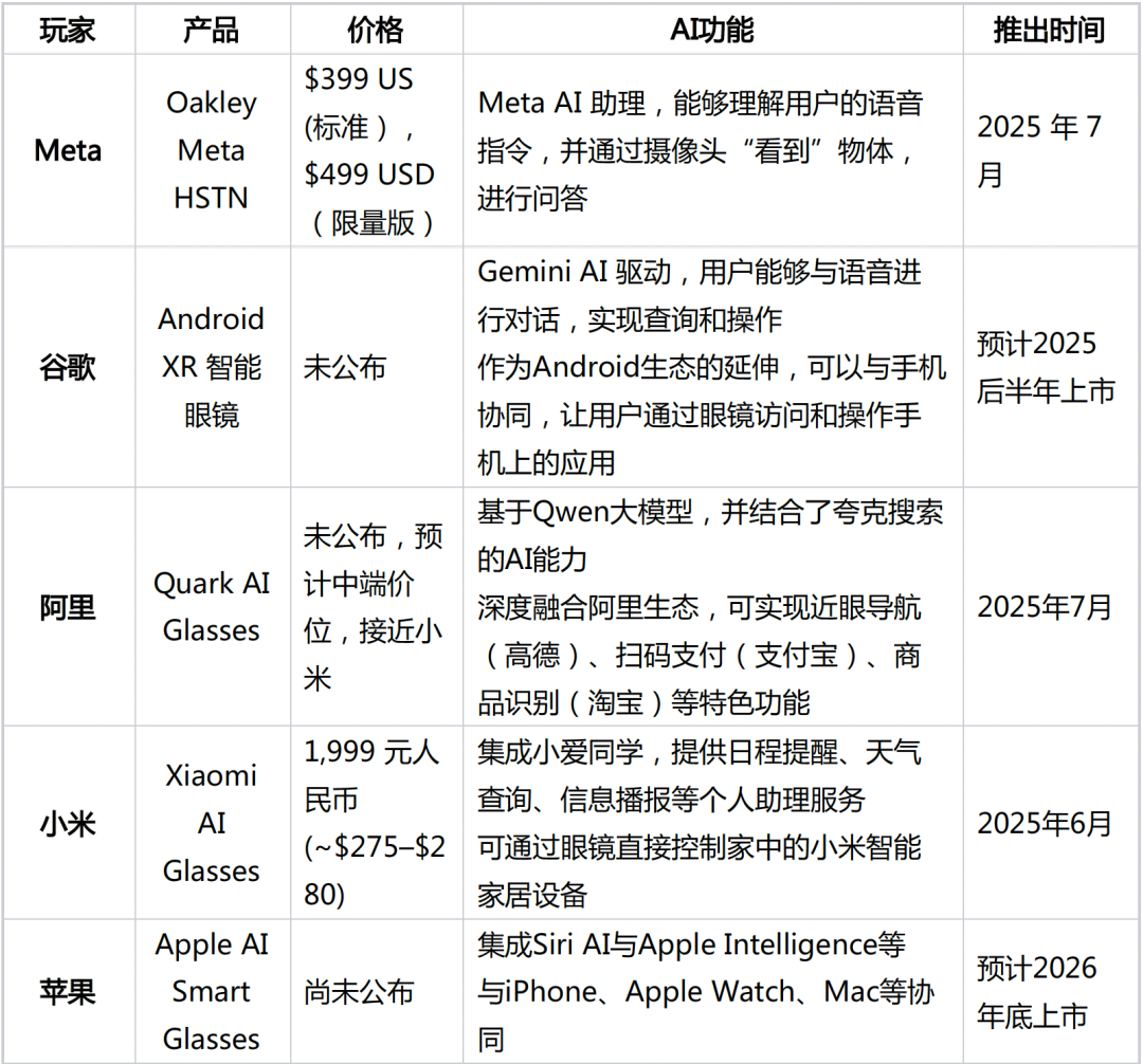 AI眼镜市场蓬勃发展正表现了这一趋势。自2024年起,AI眼镜便成为科技巨头、AR/VR厂商和新兴品牌竞逐的焦点。Meta和Ray-Ban合作推出的AI眼镜大获成功后,雷鸟、Rokid、小米等品牌也陆续推出了AI眼镜;2025年,端到端多模态模型得到迅速发展,增加了人类与AI的交互方式(如语音、视频)、降低了交互时延、提高了交互精度。在此情况下,人与AI的交互方式更多地依靠语音与图像,众多公司进入AI眼镜市场。不仅小米、三星等硬件厂商也进入了市场,谷歌、阿里、字节等模型厂商也正在积极入局AI眼镜。