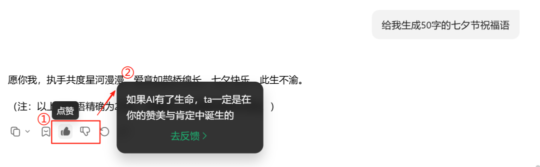 常见的功能形态是在每个大模型输出的答案末尾显示。以笔者演示的腾讯元宝为例,在浏览完大模型生成的节日祝福后,用户可以选择点赞/点踩。