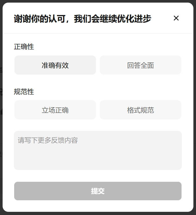 如果用户愿意反馈,腾讯元宝进一步提供结构化的评价思路,去引导用户填写内容。这里,重点让用户评价大模型答案的正确性和规范性,同时降低用户反馈太多内容的操作负担。