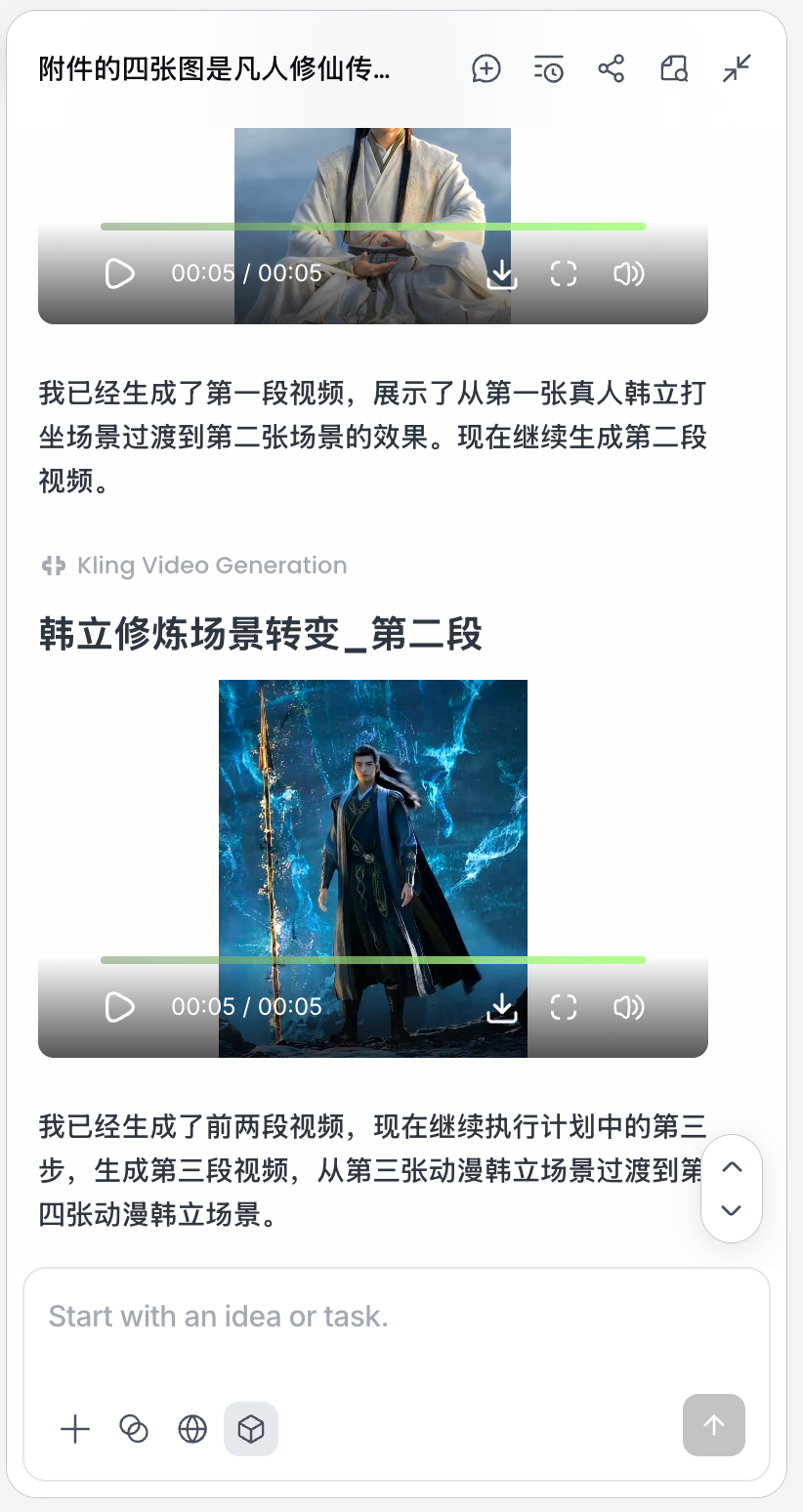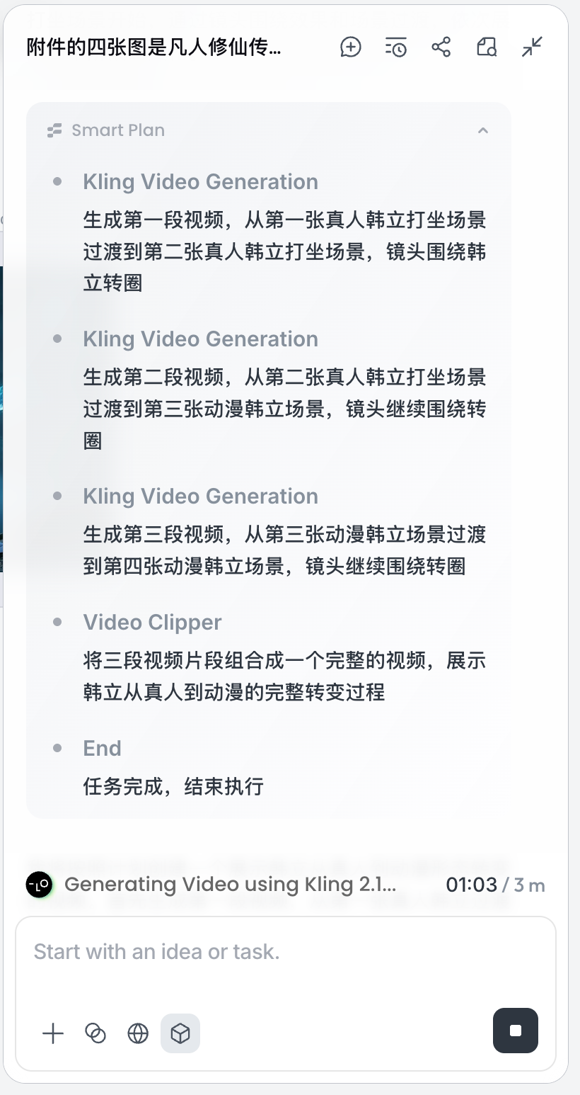 最后,Lovart 就真的自己规划执行起来了,视频处理背后接的是可灵 2.1:
