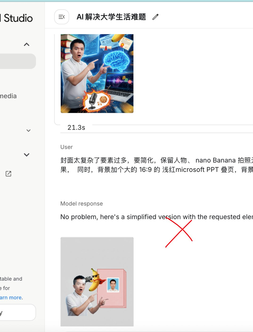 整个流程变成了 :带着需求去 ChatGPT 讨论形成提示词后,回到 AIStudio 里用Nano Banana 生图、改图