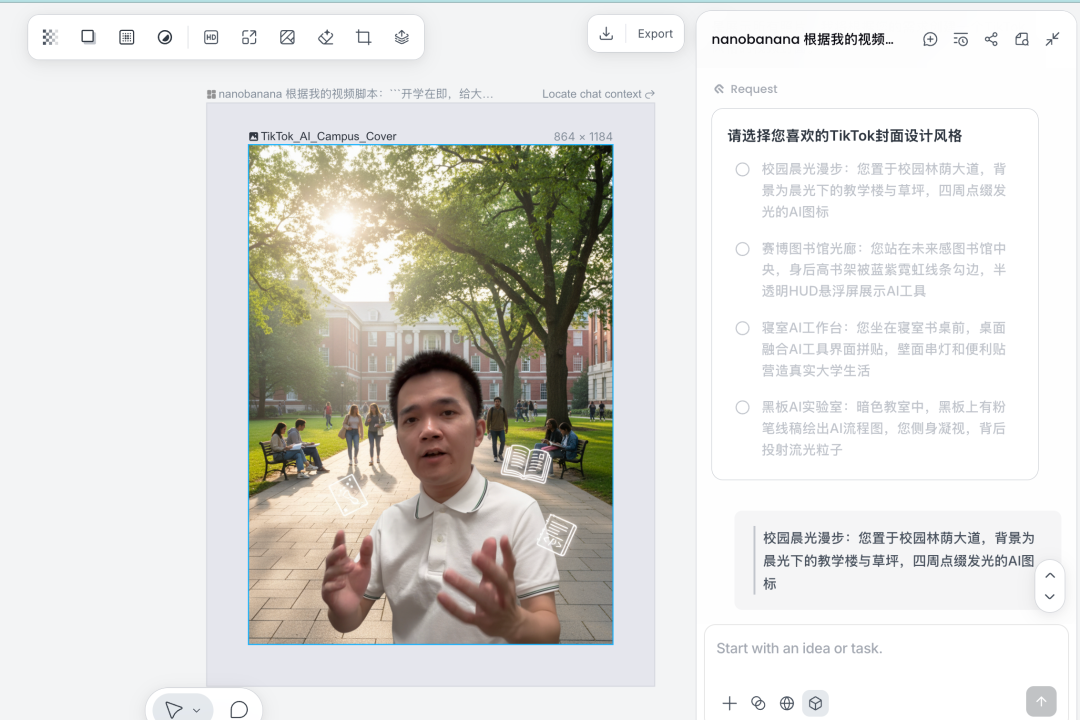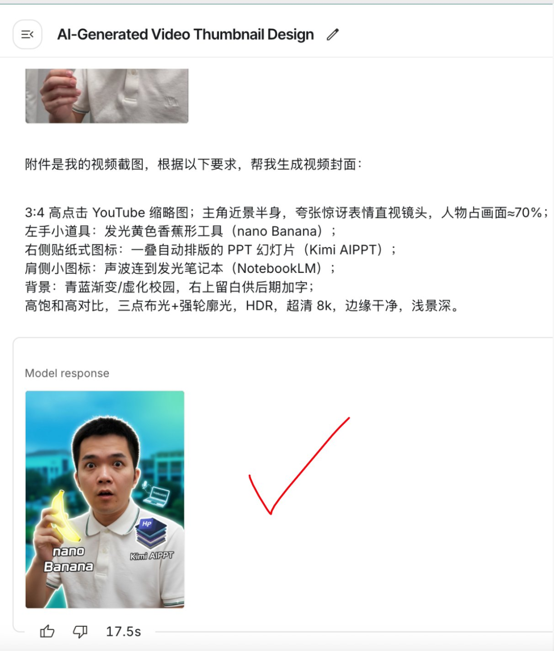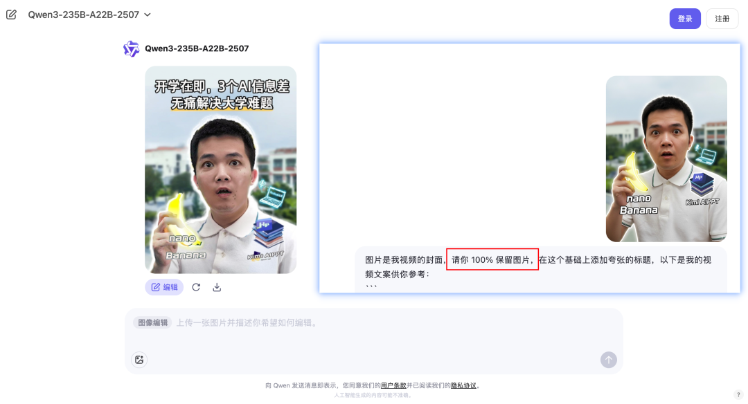 虽然把我整成了大头娃娃,但你就说效果是不是比 aistudio 里做的好吧,而且上面留空的位置 Lovart 提醒我可以拿来加文字作为标题。