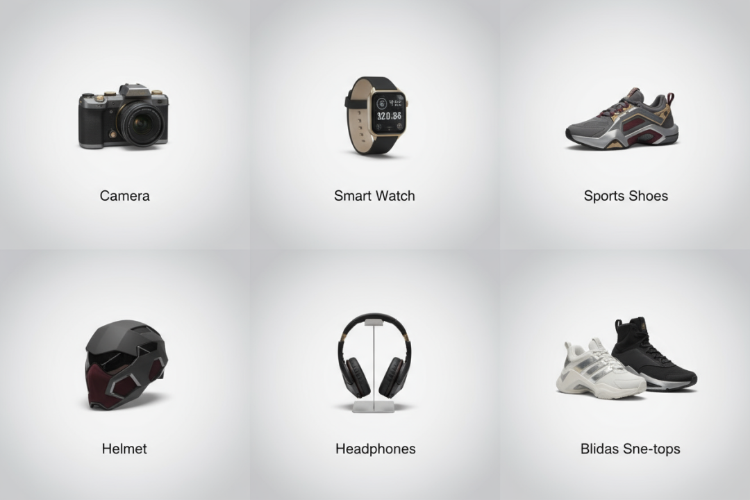 从场景图中,精准识别并分离出各个独立的商品(如相机、耳机、鞋子等),并以陈列的方式展示介绍