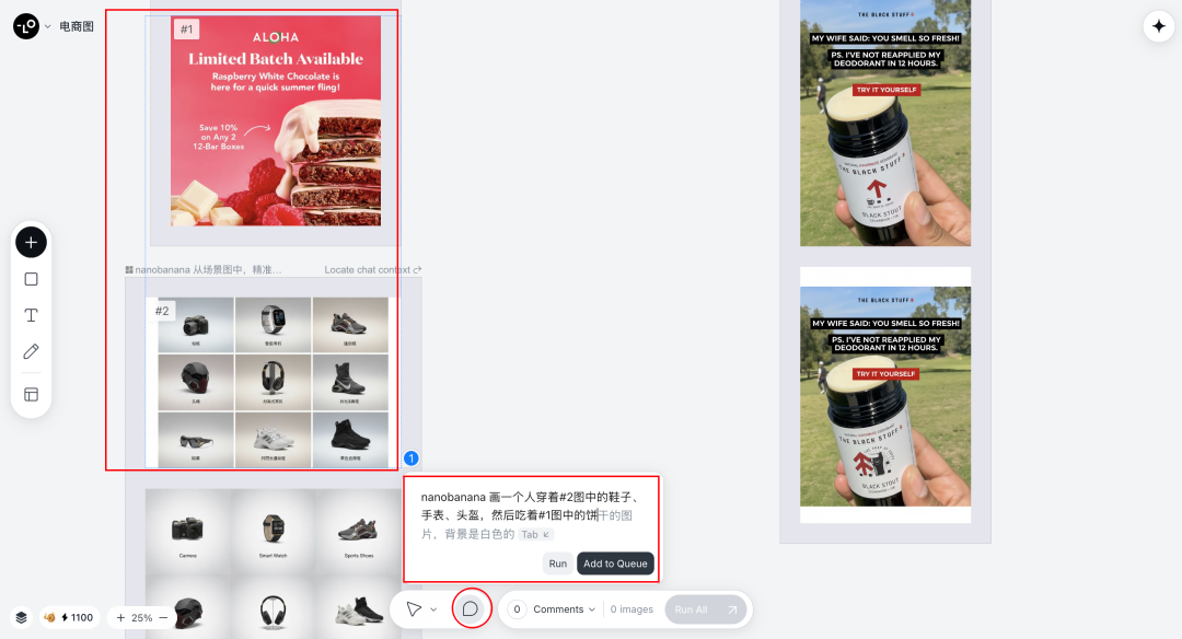 更绝的是,可以随意在画布中圈选,例如我把刚才的饼干和鞋子等商品圈起来提需求