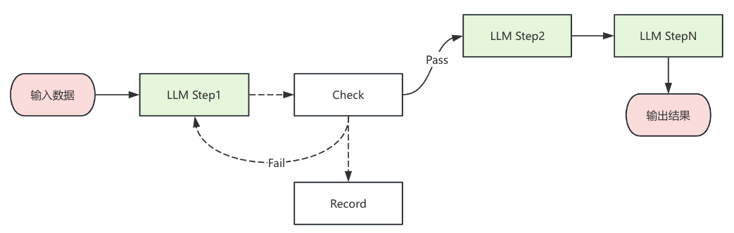 链式工作流很适合任务可以清晰地分解为固定子任务的情况,把一个大任务拆分为一步步的分析、检查的子任务,上个LLM的输出作为下一个LLM的输入,通过简化每次 LLM 调用,以降低延迟并控制每一步的质量以提高整体的准确率,如:生成一份会议的总结,并且把文档翻译为英语。这个工作流也可以用于对分析结果的进一步精确,比如第一个LLM处理庞大的数据得到疑似结果,通过第二个LLM调取精准的数据范围对上一步的疑似结果进一步验证,这个方法可以极大的提升输出准确率且控制成本。