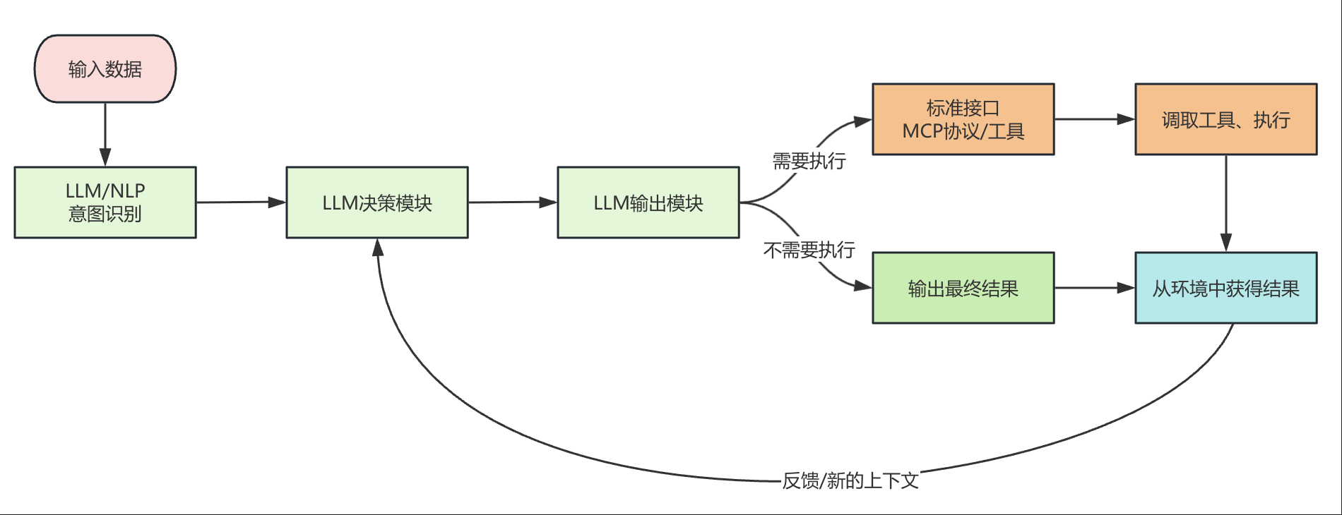 LLM输出模块可以做必要的加工,输出可以是数据、音频、文本、图片、操作指令等等以与对象交互,如果Agent需要调用工具,可以设计一个标准化接口,使用 MCP协议或其他方式与工具进行交,上面这个图几乎是个最小的智能体的结构。
