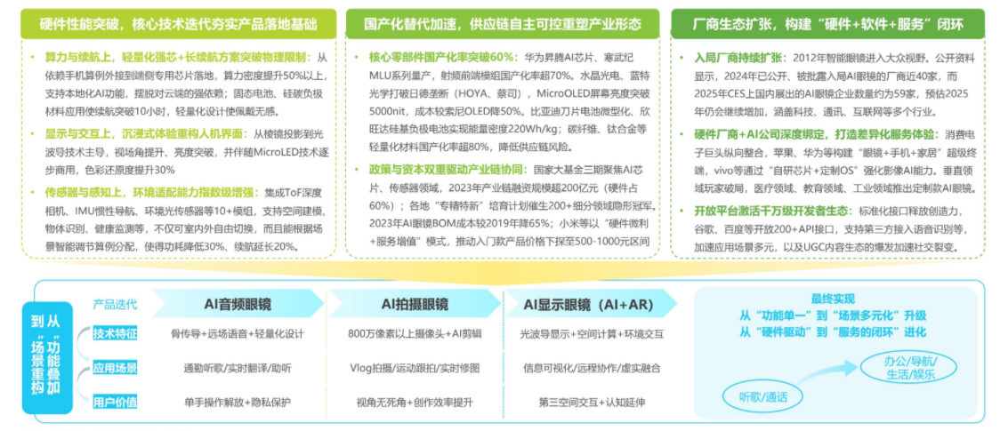 - AI交互:端云协同大模型普及,本地端实现95%以上的语音/手势识别准确率,云端支持实时多模态数据处理(如同时完成图像识别+翻译+导航);