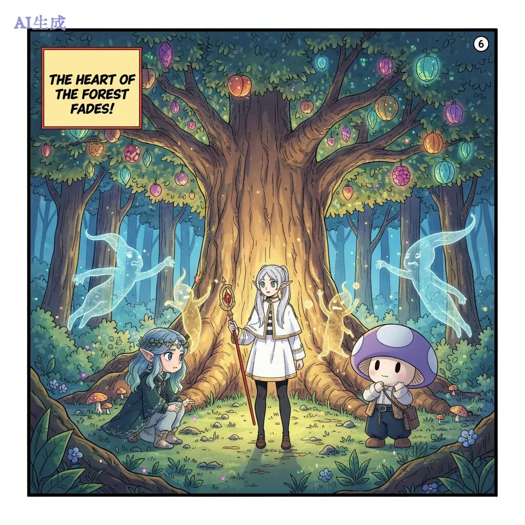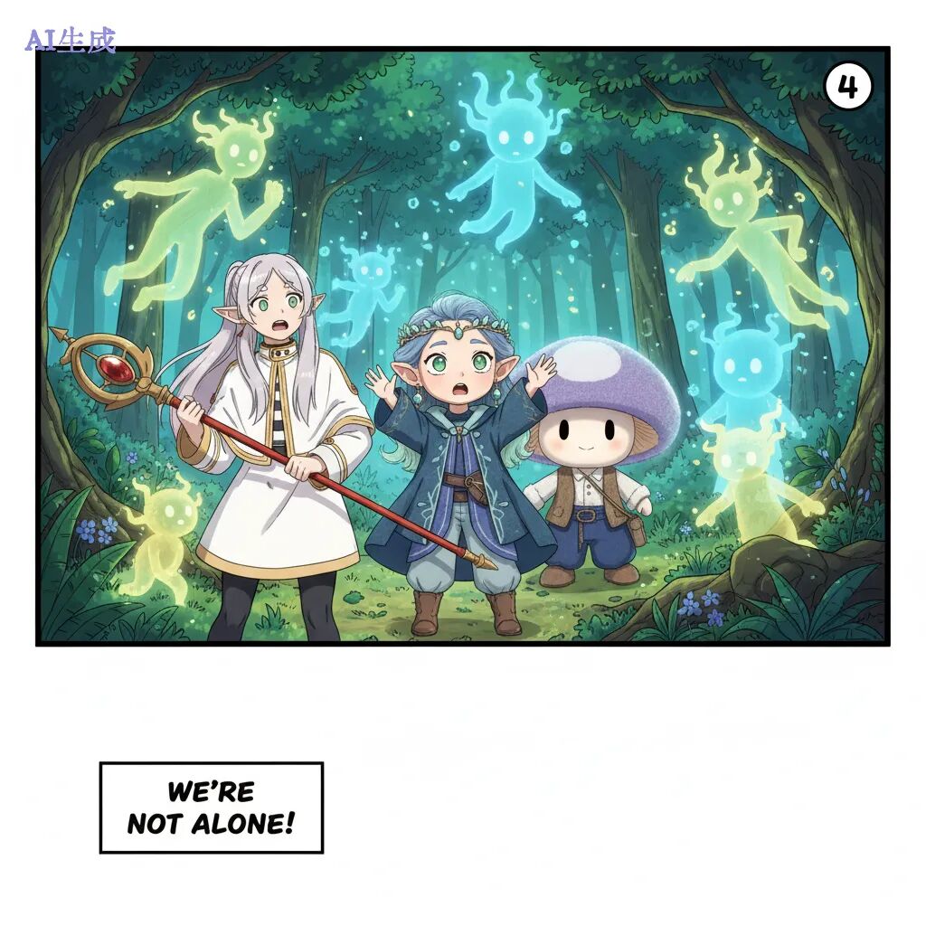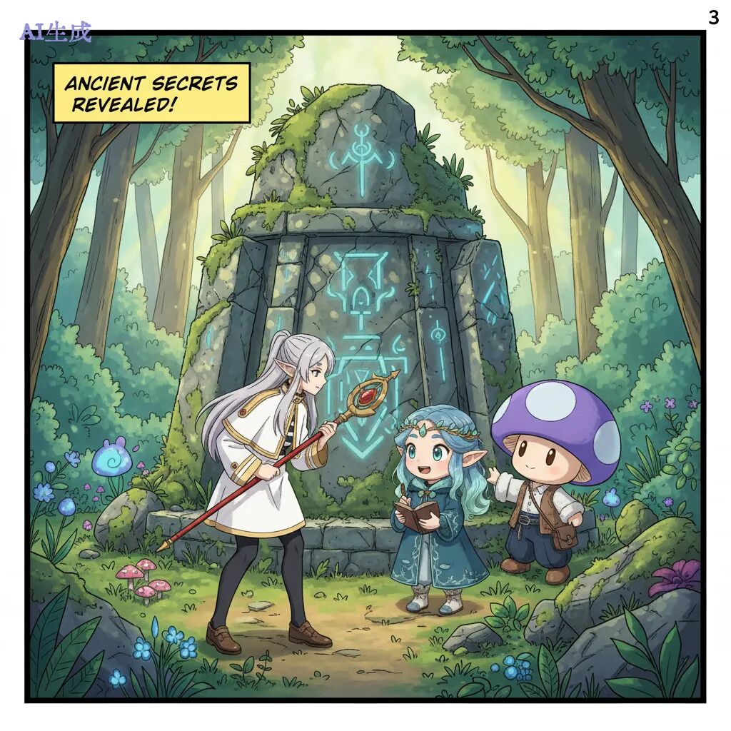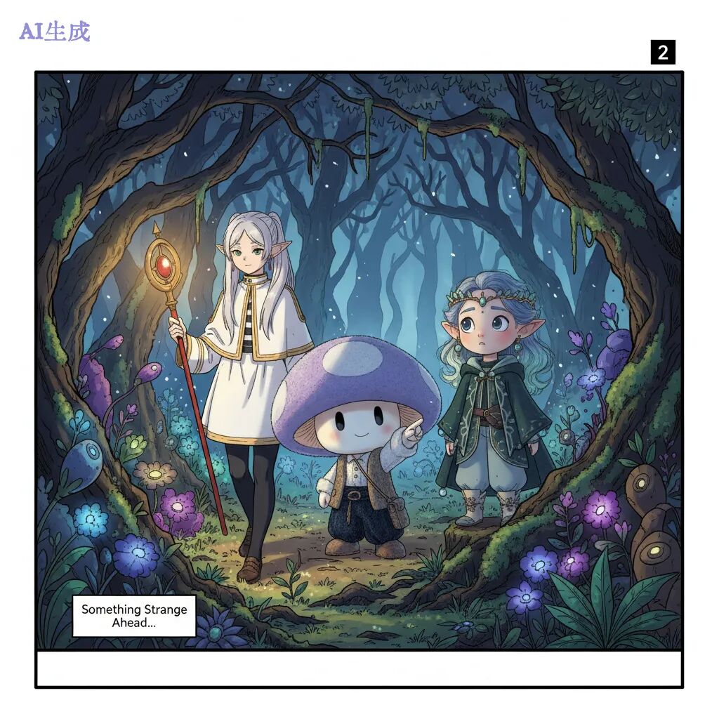 比如我想让芙利莲带着2个不知名的我AI生成的小角色露芙和蘑菇头开启一场探险游戏。