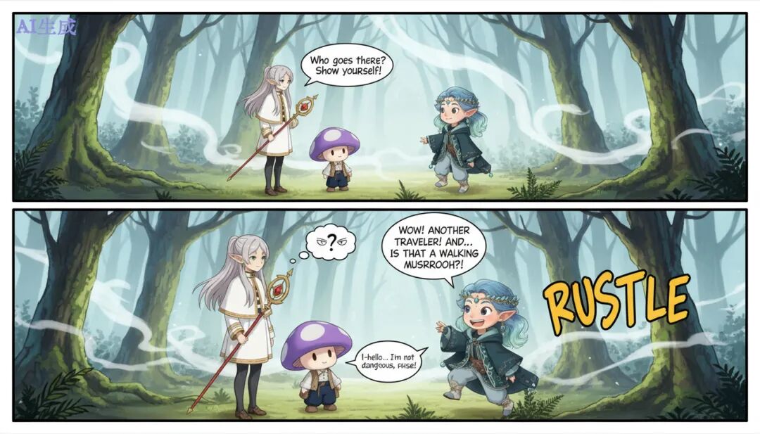 使用NanoBanana模型,根据3个主角进行多页单独的漫画分镜创作:每页1-2个镜头,完整迷你故事情节,丰富的表情动作变化,彩色漫画风格,包含对话框、心理独白、音效文字。