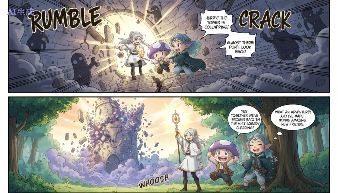 使用NanoBanana模型,根据3个主角进行10页单独的漫画分镜创作:每页1-2个镜头,完整迷你故事情节,丰富的表情动作变化,彩色漫画风格,包含对话框、心理独白、音效文字。