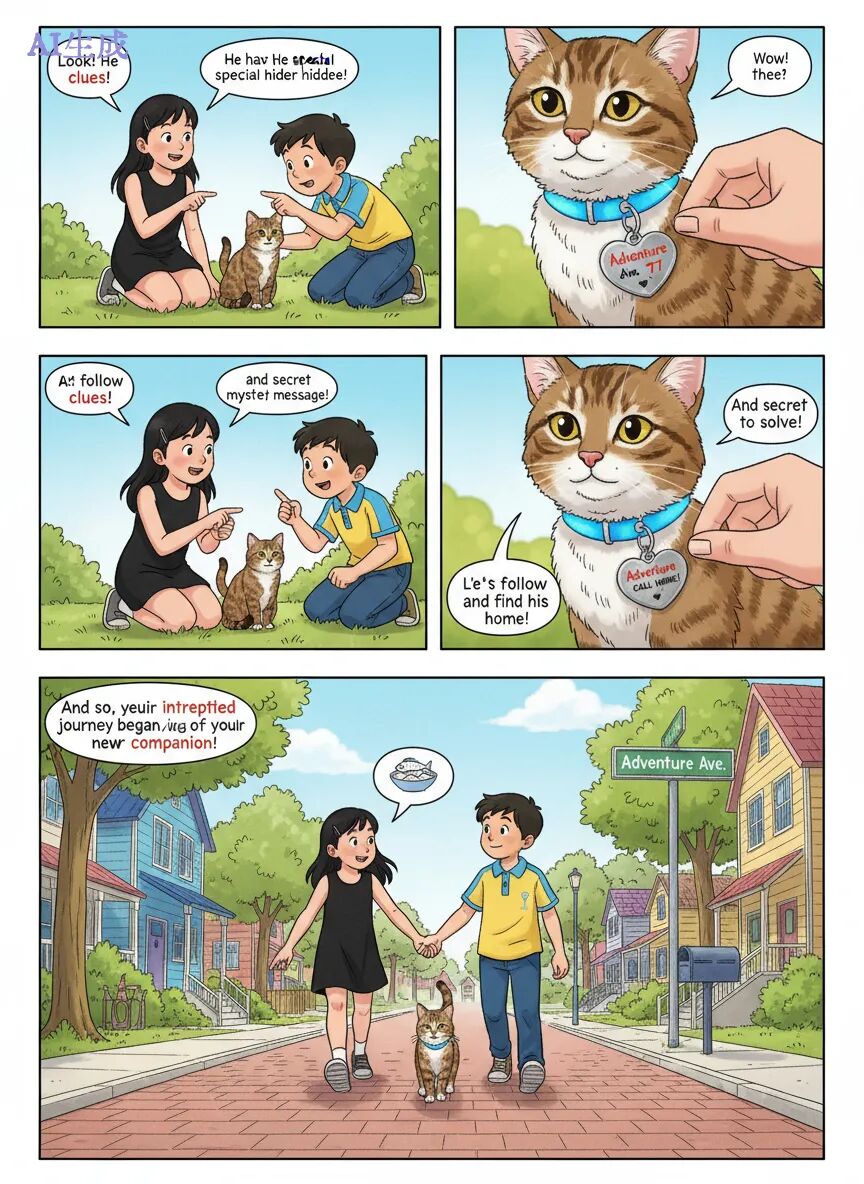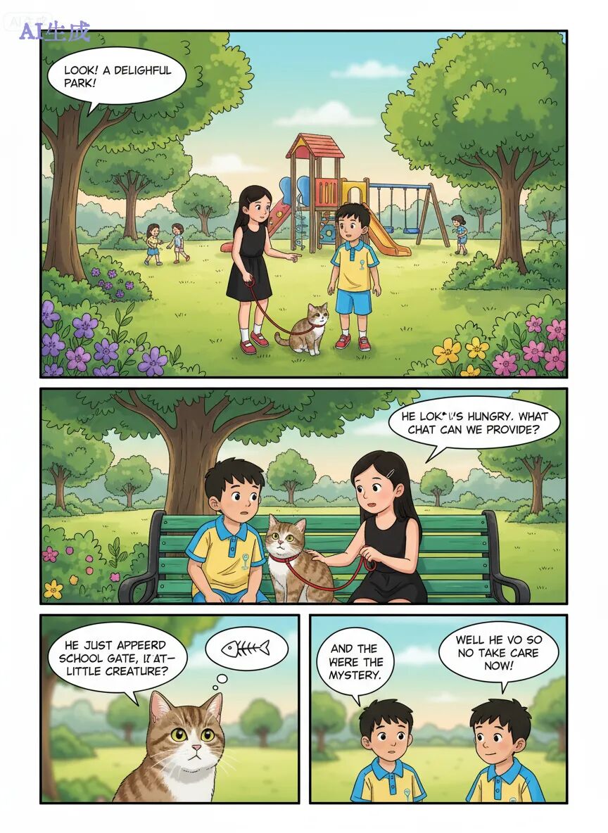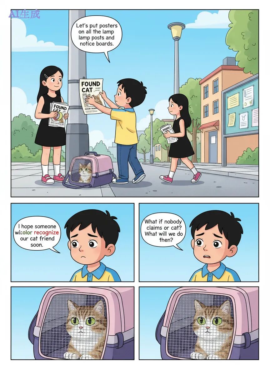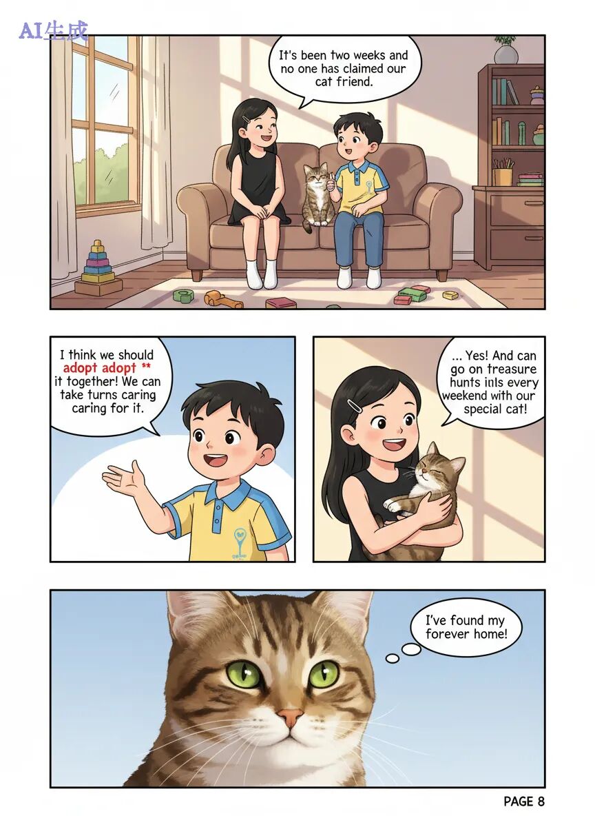 使用NanoBanana模型,绘制一部8页的彩色漫画,主角为上传的三位角色(猫、小女孩、小男孩),保持人物形象一致。