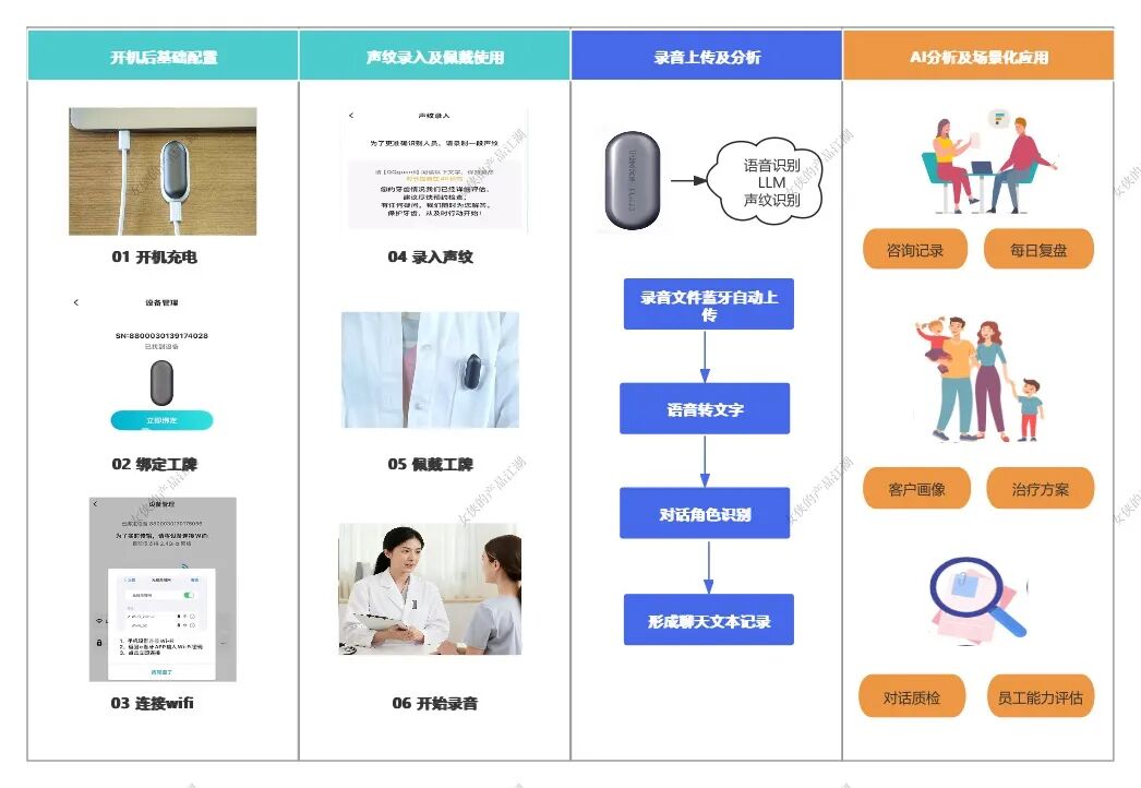 根据领健官方发布的智能工牌教程,我们可以看到其录音流程和Plaud NotePin的使用流程一致,差异化主要体现在对录音文件的应用。领健将录音文件应用在咨询记录、客户画像、员工能力评估等场景中,并结合它的SaaS软件系统予以呈现。