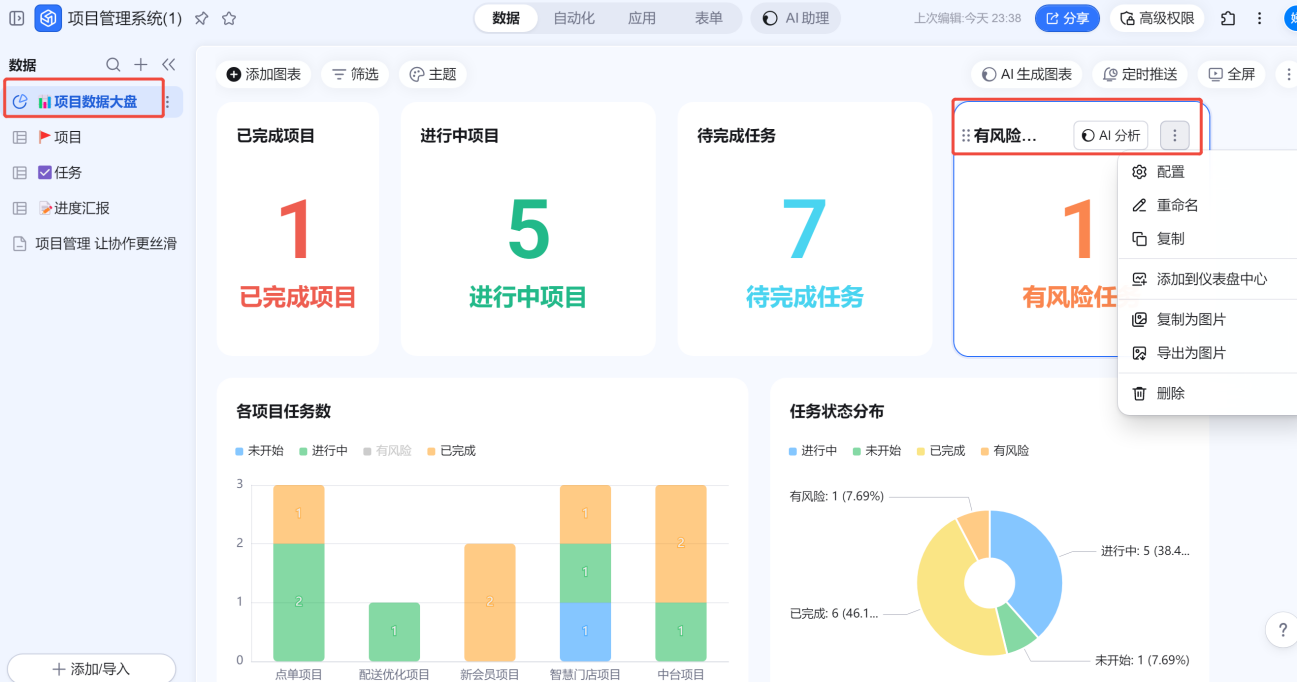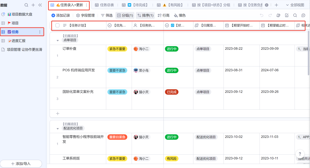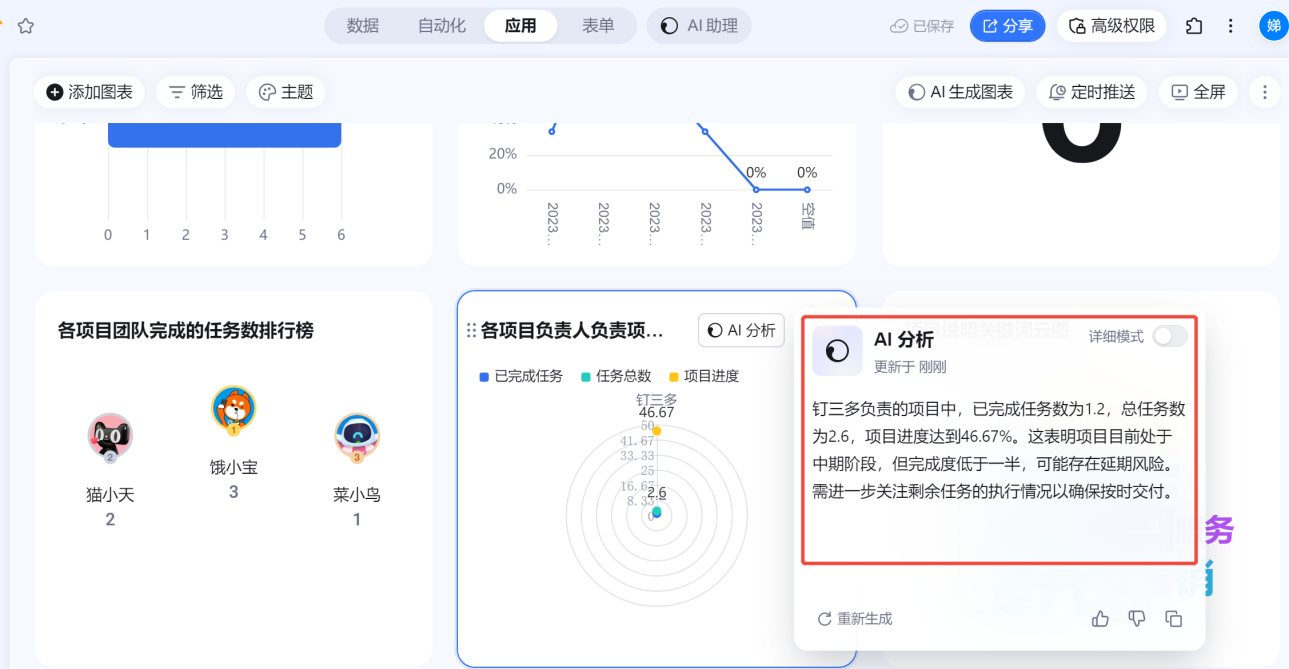 以前想针对项目进度、成本等做分析,需要每天盯着项目组员更新任务进度等,再用表格对相关数据用VLOOKUP等各种函数一顿操作,而现在当项目组员在执行任务过程中,在钉钉端简单操作,即可实时更新任务进度。那钉钉AI表格会自动捕获这些更新信息,并同步到项目任务全景表中,实现项目进度的实时跟踪。