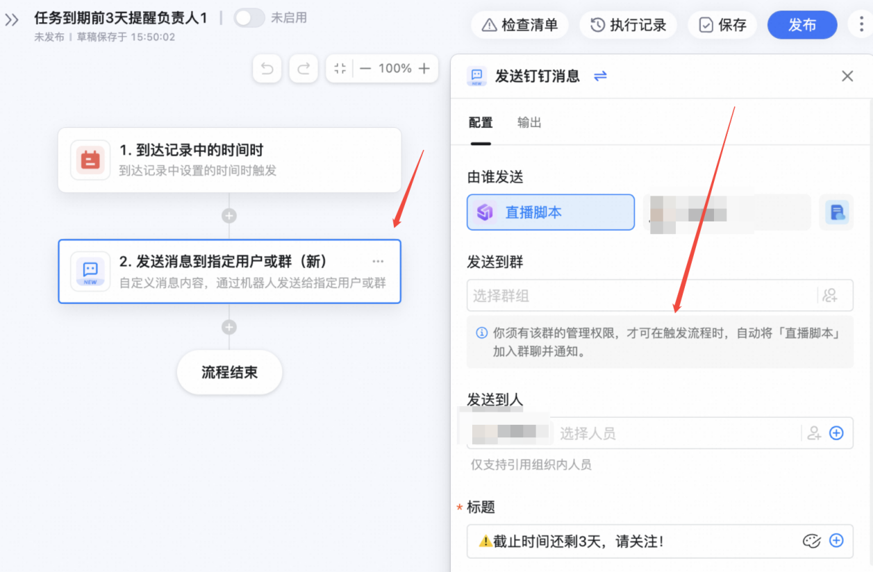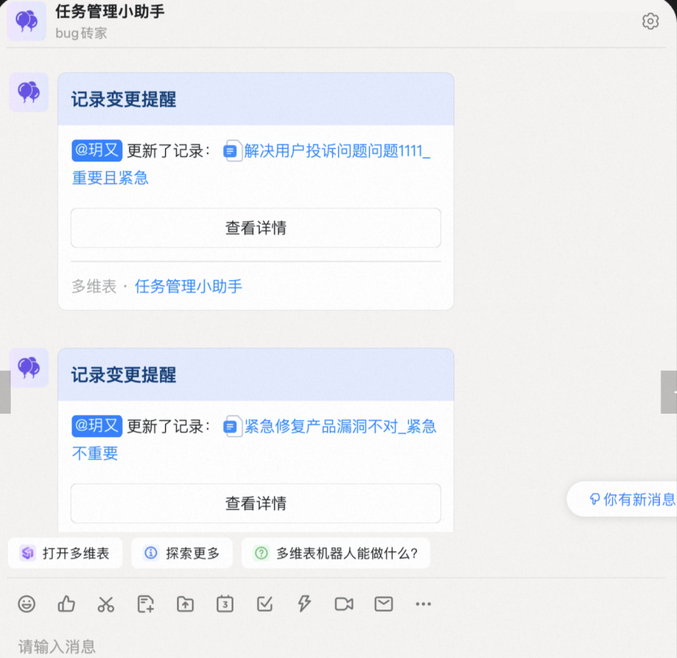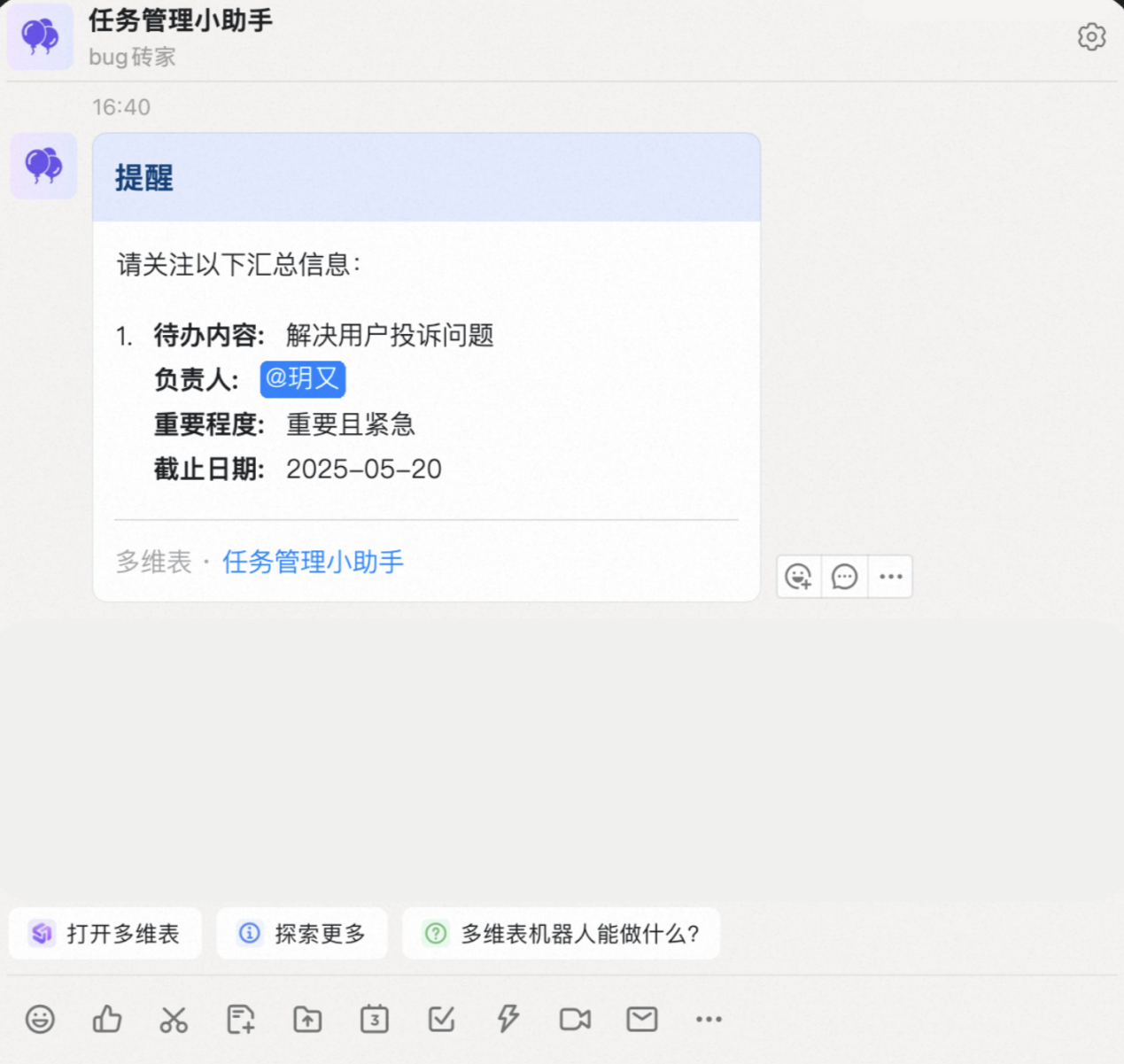 - 项目临近截止日期未完成,发送自动化消息提醒任务负责人跟进。