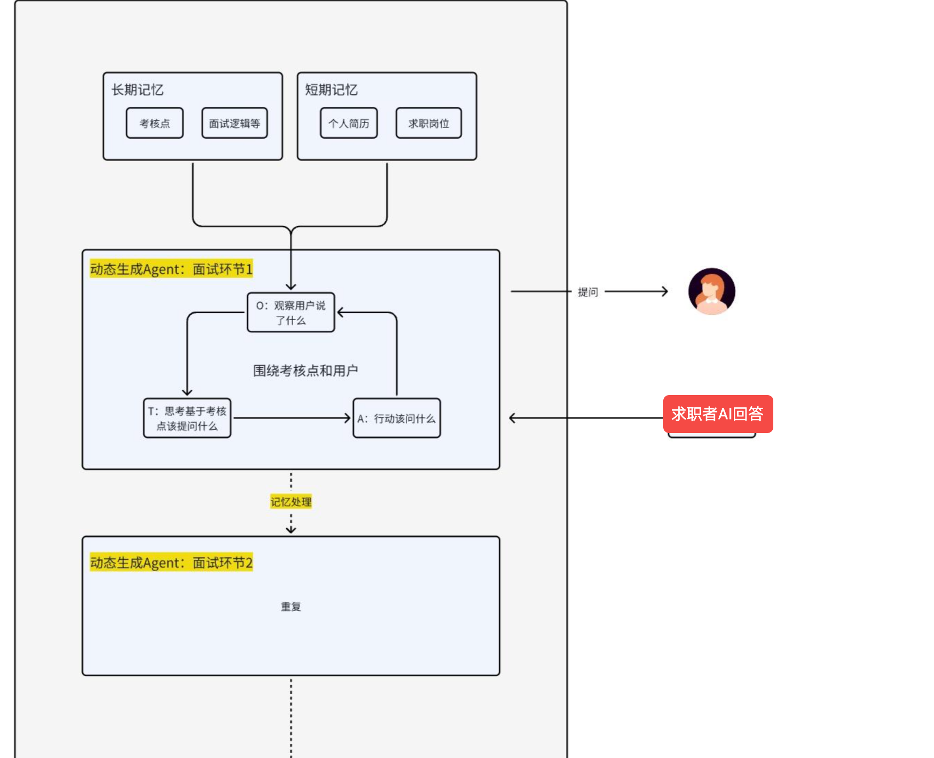 像个HR一样提问,进行综合考察,多agent协同,围绕五个维度展开,独立Agent: