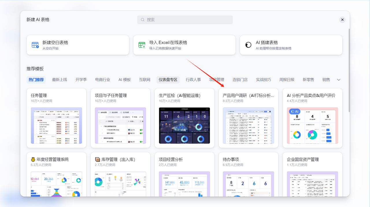 - 打开钉钉工作台→点击“AI表格”→点“新建”,直接在“热门推荐”分类里选“产品用户调研”模板,里面不仅有“需求内容”“用户类型”,还自带“反馈时间”“需求紧急度”“跟进状态”这些实用字段。