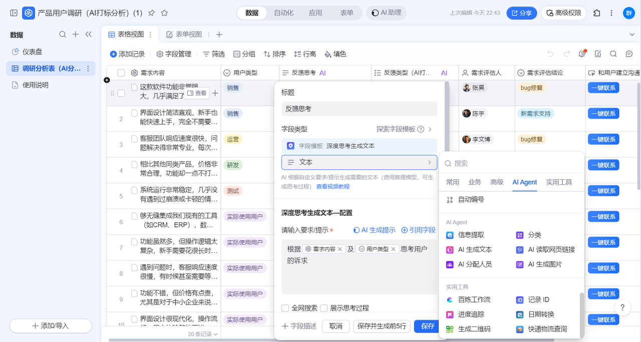 - 反馈思考(AI提炼):遇到用户写的大段反馈(比如“我是做电商的,觉得现在的库存预警只能看总数,想按SKU分,而且希望快到阈值时自动发提醒”),AI会自动提炼成“电商用户需求:库存预警按SKU拆分+阈值自动提醒”,省了我逐句读的时间。更省心的是,这些AI分析结果会实时同步,比如早上9点销售提了个反馈,9点01分AI就出了标签和优先级,我打开表格就能直接安排跟进,不用等“集中分析时间”。