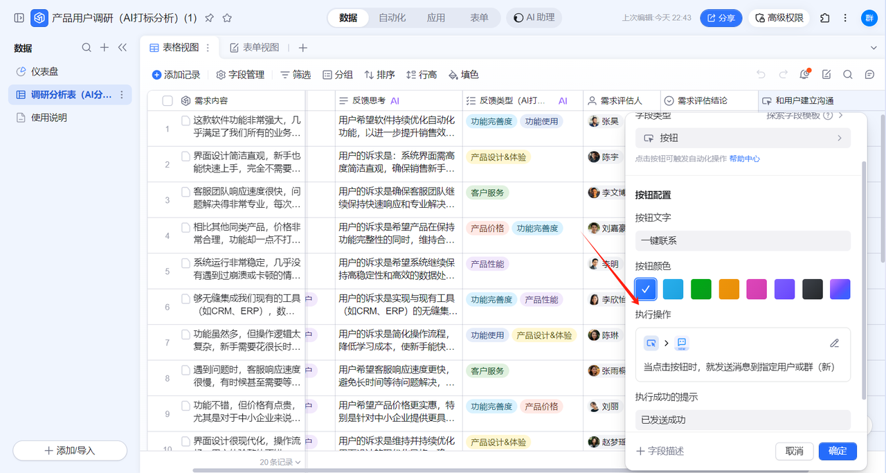 我在表格里加了个 “一键联系” 按钮,配置了触发场景: