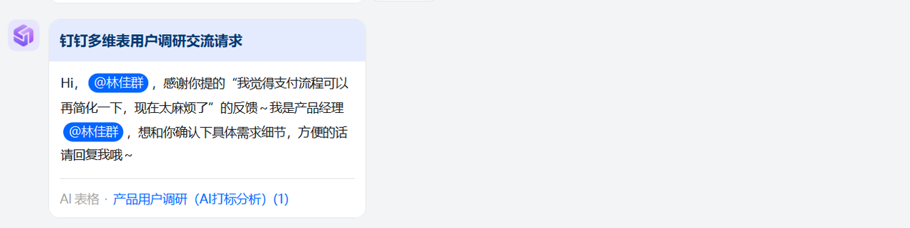 点击按钮时,自动给用户发钉钉消息,消息内容是预设好的模板:“Hi,[用户姓名],感谢你提的【[需求内容]】的反馈~我是产品经理 XX,想和你确认下具体需求细节,方便的话请回复我哦~”, 不用每次手动打字;
